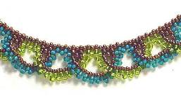 Use seed beads in three different colors to create this softly draped necklace. Contrasting color loops overlap to give a complex, interwoven appearance. Actually, this necklace is easier than it looks.