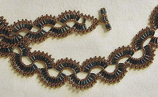 This design was inspired by the Russian Wave pattern, but is worked very differently. Overlapping fans of bugle beads are joined with a Peyote stitched edge to create this lacy necklace that follows the curve of the neck. Use of different size seed beads along the edge gives a pleasing texture and helps create the curves. A matching bracelet completes the set.
